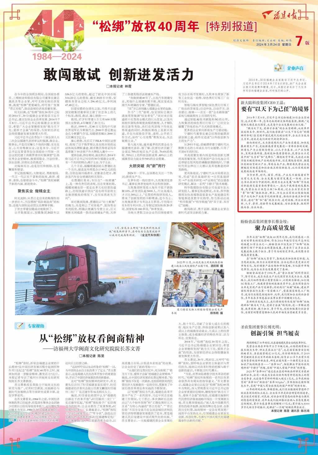 值此習(xí)近平總書(shū)記回信十周年之際,福建日?qǐng)?bào)推出6版《“松綁”放權(quán)四十周年特別報(bào)道》,特別專訪當(dāng)年寫(xiě)信的企業(yè)家代表新大陸科技集團(tuán)CEO王晶。今日官微轉(zhuǎn)發(fā)報(bào)道全文,以饗讀者。